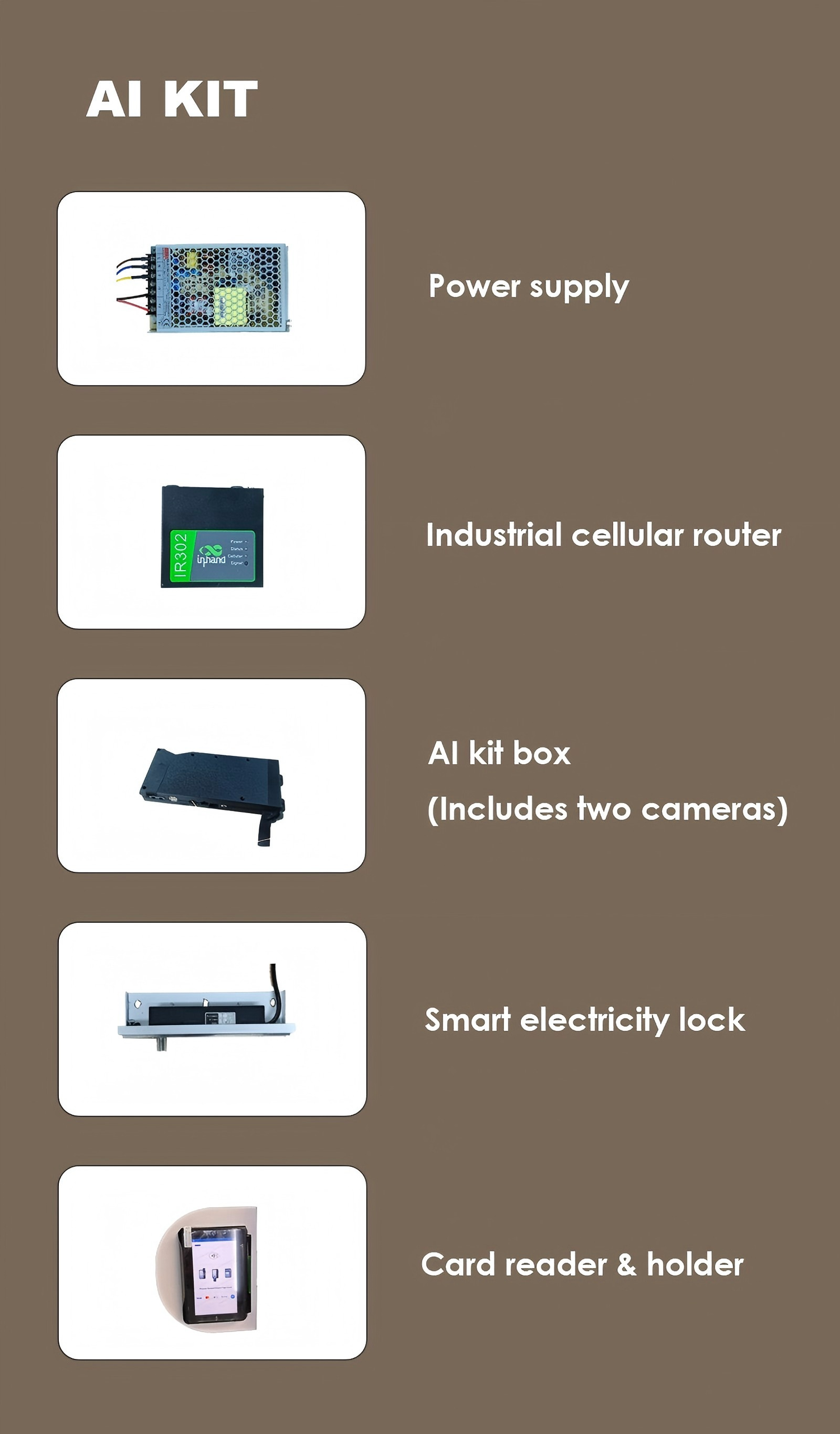 Turn your regular fridge into a fully automated AI vending fridge. Our AI Kit for Fridge includes everything you need—dual cameras, smart lock, router, card reader, and power supply—to instantly launch your own AI vending machine business.